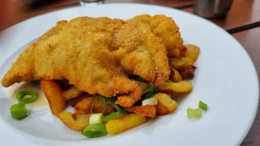 Ich entschied mich für eine Pfifferlingsrahmsuppe mit hausgemachten Serviettenknödeln. Die Suppe war von außergewöhnlicher Feinheit und harmonischer Geschmacksfülle. Besonders bemerkenswert waren die delikaten Lauchzwiebeln und Radieschenscheiben, die quasi roh auf dem Teller mit der Suppe arrangiert waren und eine erfrischende Knackigkeit sowie würzige Aromen verliehen. Die kunstvoll angebratenen Serviettenknödel stellten einen gelungenen Kontrast dar und ergänzten das Gericht auf vorzügliche Weise. Als Hauptgang wählte ich die beliebten Fischstäbchen aus Fjordlachs, begleitet von einer Remoulade, Kartoffelpüree und einer Variation von knackigem Rohgemüse. Das Gericht erwies sich insgesamt als zu Recht ein Klassiker, denn es überzeugte durch seine harmonische Geschmacksabstimmung, einschließlich der köstlichen Soßen. Einzig das Kartoffelpüree könnte noch eine Spur cremiger sein, um das Gesamterlebnis abzurunden. Zum Abschluss wurde uns ein Schokoladeneis aus Hafermilch auf Fruchtpüree serviert, das mit seiner Anmutung an Schwarzwälder Kirsch einen erfreulichen Genuss bereitete. Die angenehm säuerlichen Früchte und die verlockende Kombination aus Eis und Haferflocken vervollständigten das Dessert. Alle Gerichte wurden liebevoll angerichtet und das Serviceteam überzeugte mit lockerer und humorvoller Art sowie aufmerksamer Betreuung. Ich kehre immer wieder gerne hierher und genieße auch den traditionellen Porttonic 11A, eine Kreation aus weißem Portwein, Tonic Water und Gurke.