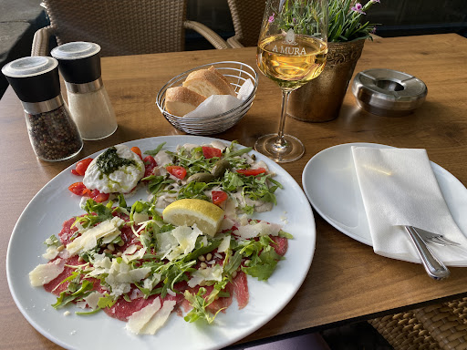 I was attracted to A’Mura by the ‘Leine wave’ surf location and the parking area right across where I easily found a space despite it being best dinner time and a lovely warm evening. I also found a table right by the front on the outside terrace after the very friendly young waitress allowed me a look at the menu. There are lots of tasty things to choose from. I decided on the “A’Mura Tres” a mixed plate of my favorite Italian appetizers: Vitello Tonnato, Carpaccio and Ensalata Caprese (Tomato and fresh Mozzarella). I also ordered a glass of Frizzantino. The wine came prompt and was perfectly chilled, served in a lovely tall and clean wine glass and it was a generous amount. The appetizer followed shortly after accompanied by a bread basket. The Vitello was scrumptious, right amount of delicate thuna cream sauce and capers, topped with one of my favorites: a large caper-berry. The carpaccio was lovely and thin, topped with Parmesan shavings and drizzled with a good quality olive oil. And the caprese was actually a good portion of Burrata on a bed of cherry tomatoes topped with a delicious pesto. The entire plate was garnished with crips Rucola leaves. The black pepper mill on the table came in handy. The bread was tasty, fresh cut with a nice thin crust. All in all a very pleasant experience. I would definitely go again for another visit. It’s a great location as well and close...