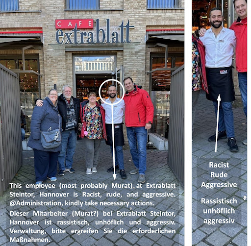 Subject: Concerning Discriminatory Behavior at Café Extrablatt, Steintor by one particular employee (picture attached)