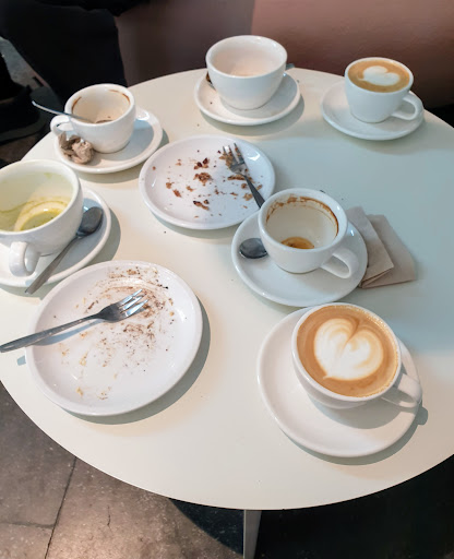 Read moreOne of the most disappointing stores. Coffee and staff/service combined receive only 1 star. The employees (not all of them) are really unfriendly. The coffee tastes like boiled milk, 200 degrees, and I have to wait 15 minutes before I can drink it. Cleanliness is an unknown word for the store. There are many times that I drink my coffee in a table full of other people's cups, dirty, and the employees are just playing with their phones and laughing behind the bar. The only 2 good things about this place are basically the location and a few sweets. In the photo, only the 2 full cups of coffee are ours. The table remained dirty with the cups of the last customers...