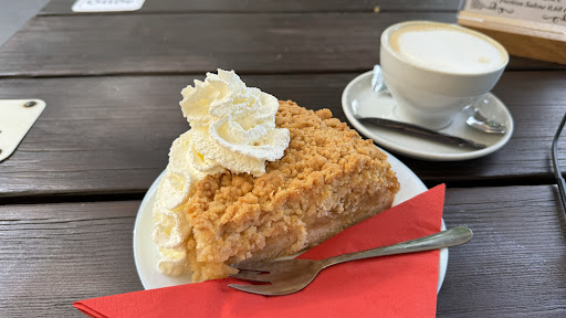 Zum Apfel-Streuselkuchen: Die Füllung ist sehr saftig durch die Kombination aus regionalen Äpfeln (nach Angabe des Lokals) und Apfelmus. Die Streusel sind schön knusprig, der Mürbeteigboden schön fest und nicht durchgeweicht, aber gut durchgezogen. Ein Erlebnis, als würde man einen großen Apfel-Keks essen. Sehr lecker! 👌🏼 Vielleicht nicht unbedingt etwas für Menschen mit Prothese. Hier würde ich dann eher den Zupfkuchen oder die Sahnetorte empfehlen.