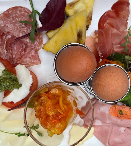Schinken & Käse – je 1,5 Scheiben, so dünn wie Pergamentpapier. 4 Scheibchen scharfe Salami . Vorlieben wurden nicht angefragt. Antipasti? Zwei Scheiben Aubergine, vier Möhrenstreifen und ein Teelöffel Pesto – bestehend aus Basilikum und Öl. 2 Scheiben Tomate mit 2 Scheiben Mozarella Melone? Vier kleine Stückchen.