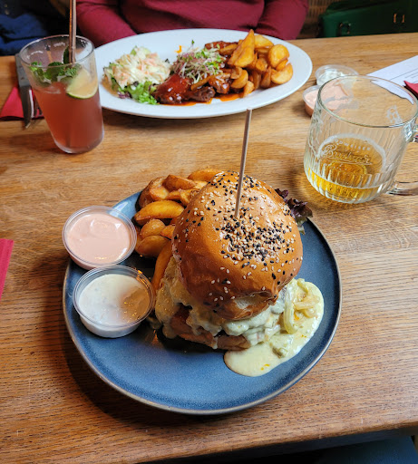 Read moreIch bin schon oft an dem Lokal vorbeigefahren. Jetzt durch eine Gruppe endlich auch mal rein. Das Ambiente war gemütlich und hatte Charme. Wir waren eine recht große Gruppe, es fing aber doch gut organisiert an mit der Aufnahme der Bestellungen. Danach wurde es leider chaotisch. Die Bestellungen, die als Letztes Aufgenommen wurden, kamen als Erstes, die Bedienungen wirkte überfordert. Wir hatten als Vorspeise die Taccos mit dreierlei Dip bestellt, eigentlich keine aufwändige Vorspeise, doch darauf haben wir ganze 60 Minuten gewartet und wurden dann auch etwas entäuscht. Die Taccos waren lieblos und kalt auf einen Teller gekippt, die Dips wirkten nicht selbstgemacht. Der Hauptgang kam dann weitere 20 Minuten später. Wir hatten den Käsevulkan und Der mit dem Stier tanz. Im Großen und Ganzen waren die Burger gut, beim Käseburger fand ich die Konsistenz der Soße etwas gewöhnungsbedürftig der andere Burger war etwas lieblos zusammengebaut und es war nicht so richtig ersichtlich, was da alles an Belag drauf war. Was wir etwas verstörend fanden, wir hatten eine Tisch mit Blick auf den Bereich der Essensausgabe, das Gerichte den Weg aus der Küche direkt auf ein Regal geschafft haben. Die Gerichte sind weder zu einem Gast gebracht worden, noch waren es augenscheinlich Reklamationen. Gegessen wurden diese Gerichte von den Bedienungen so im Vorbeigehen.