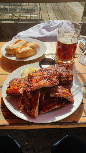 Die Atmosphäre könnte einem Waldschrat oder Neandertaler sicherlich gut gefallen. Ich entschied mich, ein Kilo Rippchen zu essen, was im Nachhinein betrachtet nicht die beste Wahl war. Die Rippchen hatten sehr viel Knochen und wenig Fleisch, was das Essen auf Dauer ziemlich mühselig machte. Vermutlich wäre man mit den 230 g Nackensteaks mit Pommes besser bedient gewesen, was zudem noch 2 € günstiger ist.