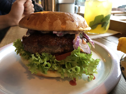 Casual and cosy burger place, with open kitchen but you don’t get smelly from the cooking. Ordered the mandarin lemonade, blood orange ginger lemonade, KUHnstWERK classic burger, truffle burger, sweet potato fries, and the maniok fries with Parmesan pepper dip. Everything was well prepared, you could really taste the grilled beef patty in the classic burger. So this is a great pick if you want to know how KUHnstWERK really cooks their meat. The truffle cream in the truffle burger was delicious; though as a whole, the truffle taste was quite diminished. There was a bit too much spinach in the truffle burger. There was definitely a lot of sauce, as many previous reviews had said, which soaked the buns. I personally didn’t mind that the buns were soggy. The drinks were quite refreshing and quite picture-worthy. The sweet potato fries were interesting, it seemed to be covered with various (I feel) asian-style spices. The maniok fries were amazing! It gives a whole other level of crispiness. The texture of the root was chewy. It was well salted, and was definitely a highlight of this entire order. Waitress/waiters spoke English and were friendly. Great place for a hangout with friends, partner, and/or family. Didn’t wait too long too, even thought he place seemed packed. I totally...