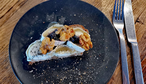 Gekrönt hat uns definitiv das Lieblingsbrot. Das Brot an sich war sehr knusprig, aber nicht komplett durchgehärtet. Obendrauf kamen mildwarme zartschmelzende Ziegenkäse, die das salzige Geschmack mitbringen. Getoppt wurde das Brot mit süßem dickflüssigem Honig und obendrauf Konfitüre, die das Süße ins Spiel mitbringen. Ein Biss durch die Mitte des Brotes hatte alles in sich gehabt – knusprig, zartschmelzend und cremig mit leicht salzigem, süßem und minimal säuerlichem Geschmack! Diese Vielfalt und Kreativität aktivieren so viele verschiedene Geschmackssinne auf einmal, das kann man einfach nicht beschreiben!
