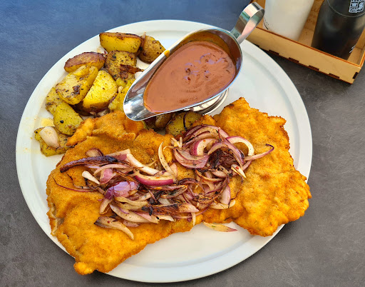 Zur Vorspeise gab es einen wunderbaren zarten milden Matjes präsentiert auf einem leicht gerösteten halben Burger Buns. Ein leichtes Dressing mit einem Hauch Knoblauch drauf gestrichen, rote Zwiebeln...zum nieder knien. Die Hauptspeise war zum einen das Schnitzel mit ☝🏻 frischen Champions, Bratkartoffeln und selbstgemachter Soße und zum anderen der Backfisch in wirklich knuspriger Panade. Schön auf Punkt gebraten innen saftig. Dazu einen Kartoffelsalat und einen frischen grünen Salat. Originell angerichtet! Schaut euch bitte die Bilder dazu an. Die Portionen sind ausreichend groß.