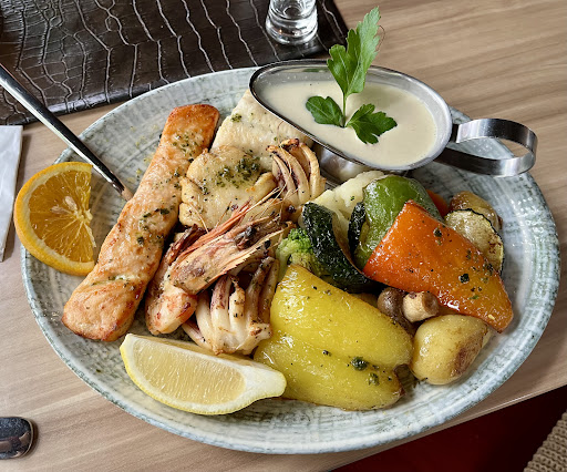 Read moreWir haben das Restaurant an einem Freitagabend besucht und waren insgesamt sehr zufrieden. Besonders hervorheben möchten wir die ausgesprochen freundliche und aufmerksame Bedienung – schon beim Betreten des Restaurants wurden wir per Handschlag begrüßt, was heute wirklich selten ist und einen sehr persönlichen Eindruck hinterlässt. Das gesamte Personal war stets präsent, sehr höflich und absolut kundenorientiert. Trotz eines vollen Hauses lief alles reibungslos und zügig – ein echtes Lob an das Team! Das Essen war gut und wie man es aus einem klassischen griechischen Restaurant erwartet. Der Fischsteller war in Ordnung, mit kleineren Fischstücken, geschmacklich gut, aber ohne besondere Highlights. Die Fleischspieße meines Mannes waren ebenfalls lecker, allerdings etwas trocken – dennoch vollkommen in Ordnung. Besonders gefallen hat uns die große Auswahl am Salatbuffet, das frisch und vielfältig war. Sehr nette Geste: Ein Gläschen Ouzo zur Begrüßung und nochmal eines zum Abschied – aufs Haus. Solche kleinen Dinge bleiben positiv im Gedächtnis. Das Restaurant selbst ist großzügig geschnitten, die Atmosphäre angenehm. Trotz vollem Haus war es nicht hektisch, was sicher auch an der guten Organisation lag. Und ein Extra-Pluspunkt: Hunde sind willkommen, was wir immer als sehr sympathisch empfinden. Insgesamt geben wir 4 von 5 Sternen – nicht, weil etwas schlecht war, sondern weil das Essen zwar gut, aber eben nicht außergewöhnlich war. Trotzdem: Ein sehr schöner Abend, wir kommen...