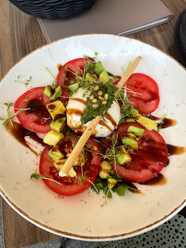 Wir entschieden uns, draußen Platz zu nehmen, da das Wetter es erlaubte. Kaum hatten wir unseren Tisch ausgewählt, kam eine Mitarbeiterin vorbei, um ihn gründlich zu reinigen und sicherzustellen, dass alles vorbereitet war. Die Stühle erwiesen sich als recht bequem, auch wenn man länger sitzen bleibt. Besonders positiv fiel die Musikauswahl auf, sie passte hervorragend zur Atmosphäre und zur stilvollen Einrichtung. Kurz bevor es dunkel wurde, schaltete ein Mitarbeiter einige Bodenstrahler ein, deren Licht für eine angenehme und zugleich elegante Stimmung sorgte. Die Tische sind stabil, haben eine passende Höhe und bieten ausreichend Platz für die servierten Speisen und Getränke.