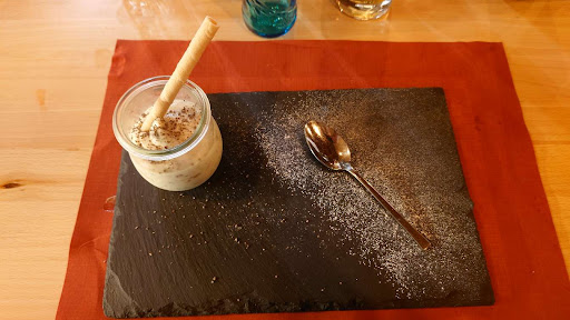 Positiv hervorzuheben ist der Service, der an diesem Abend sehr freundlich und zuvorkommend war. Leider reicht das nicht aus, um die Schwächen des Essens zu kompensieren. Ein schönes Beispiel für die Gesamtsituation im Restaurant stellt für mich das Dessert dar. Die Idee, es auf einer Schieferplatte mit einem Weck-Glas zu servieren, ist auf den ersten Blick gut. Doch bei genauerem Hinsehen wirkt das Glas verloren und etwas lieblos auf dem Teller platziert. Der Puderzucker, der verstreut wurde, macht an dieser Stelle überhaupt keinen Sinn, und der Löffel wurde quasi als Teil der Dekoration arrangiert – das lässt das Gesamtbild unfertig erscheinen. Auch hier hätte man mit ein wenig mehr Mühe einen stimmigeren Eindruck hinterlassen können.