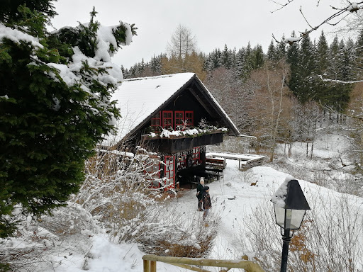 Wir waren auf einer Winterwanderung auf dem Inspektionsweg (= Wanderweg) vom „Rehberger Graben“ unterwegs und sind zum Mittagessen, in das idyllische im Brunnenbachstal gelegene „Waldcafe Forellenteich“ in der Nähe von Braunlage gegangen, um dort einen kleinen Imbiss einzunehmen.