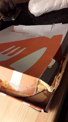 The pizza box was crushed and when I opened this is what it looked like- Always tip the drivers, usually happy with the food . Treated myself, so not so much. Also- would have given them a chance to correct it but no email available--and my German is obviously not so good. :)