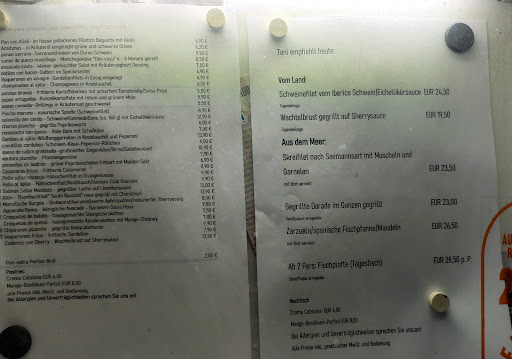 Bei Aussuchen der Gerichte war ich schon enttäuscht: Die Tapas-Auswahl ist für einen Spanier sehr klein, Hauptspeisen Auswahl ebenfalls gering und deutlich zu teuer. Nun gut, ich wählte Schweine-Filet, andere dafür viele Tapas und noch 2 Hauptgerichte. Wir baten beim Bestellen ausdrücklich die Bedienung doch bitte alles zusammen zu servieren. Was dann jedoch folgte war eine Katastrophe: Die Wartezeit war schon nicht kurz, dann kamen jedoch alle Tapas jedoch keine der Hauptspeisen. Ca. eine halbe Stunde danach, alle Tapas waren vertilgt und die übrigen Freunde dadurch hungrig und genervt, kamen dann endlich die Hauptspeisen. Ein großes Ärgernis!