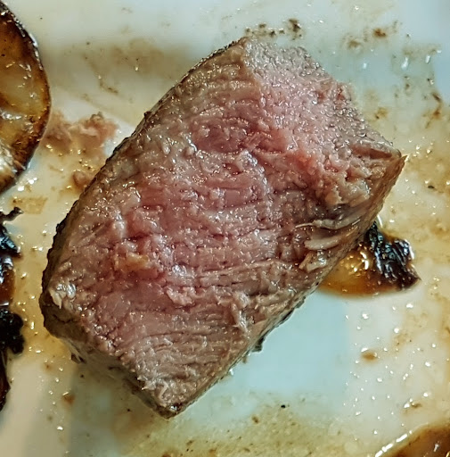 [Bild zeigt das erste abgeschnittene Stück an der dicksten Stelle des Steaks] Normalerweise kann man das bei dem Anblick oft noch essen, aber in dem Fall trafen wohl mangelhafte Fleischqualität auf Pech bei der...