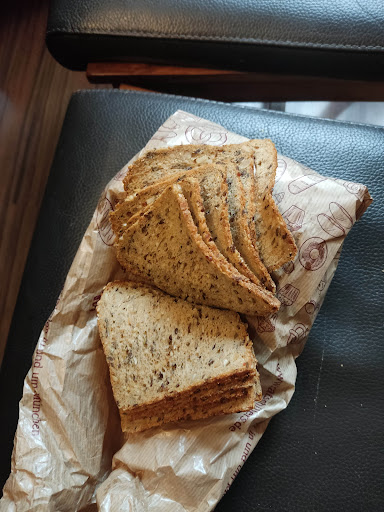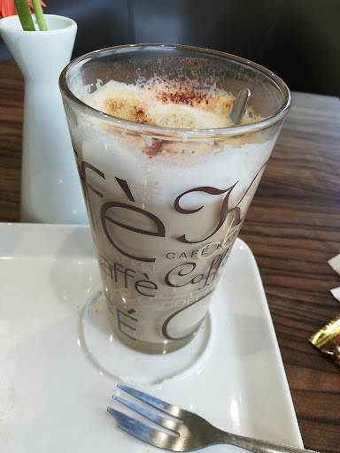 Der Kuchen leider nicht frisch aber trotzdem zum vollen Preis, der Latte Macchiato ganz OK, aber mit total nervig kurzem Löffel bei dem ich die Finger beim Umrühren in den Kaffee tunken musste. Dafuer dann relativ teuer. Und obwohl das Sandwichregal komplett vollbestueckt war auf allen Ebenen, gab es keine einzige vegetarische Option nur mit Käse, sondern ausschliesslich mit Fleisch und Wurst. Auf meine Nachfrage hin wurde mir mitgeteilt dass diese bereits ausverkauft waeren. Um dreiviertel neun morgens?!? Einrichtung schmucklos aber...