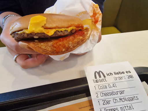 Naja es ist halt ein MC Donalds. Auswahl wie überall, leider immer noch zu wenig vegane/ Vegetarische Gerichte. Das liegt aber nicht an dieser Filiale selbst. Was mich störte waren die Hamburger, meine waren so zusammengeschmissen gut essbar ist anders. Sauberkeit war OK. Personal war aber schnell, und lieferte schnell an den Tisch. Die Zufahrt ist etwas komisch aber das liegt auch ehr an den Gegebenheiten. Leider ist auch bei diesem MC D. Der Parkplatz verschmutzt, von Gästen die es nicht schaffen ihren Müll richtig...