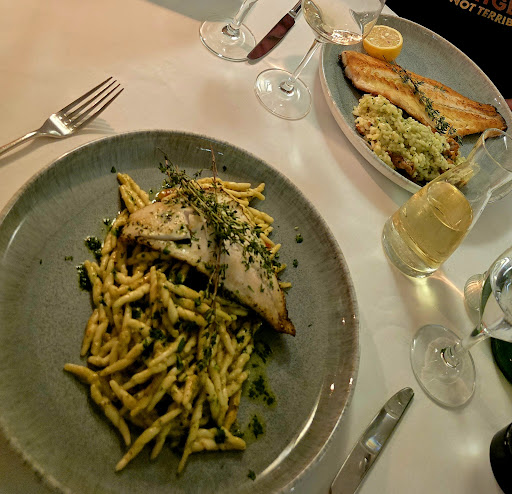 The menu, especially the daily one on the chalkboard sounded amazing. Little did we realize that it's going to be the highlight of the evening. My Mozzarella di Buffala with raw ham was an entire big mozza ball, uncut, sitting on my plate surrounded by rather thick slices of ham. Tasted fine, but no basil, no vegetables, and just the entire ball...weird, snd and way too much. The tortellini with porcini stuffing and porcini sauce was extremely rich and the sauce was tasting, well rather out of a jar then freshley made. My companion had pasta as well, and when asking for parmesan, she had to convince the waiter that, yes, she still wants it even though there is sea food in the pasts. Maybe the true Italian wouldn't do that, but who cares, just bring it, don't tell us how to eat our food please. Waiter was friendly but slow, forgot the wine, didn't come asking for desserts.