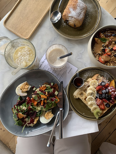 The flat whites arrived and they were more like lattes. They were good, just not your traditional flat white in a 6 oz. cup. Next was the massive breakfast we ordered. The bowls were good and packed with everything they listed. Made it quite heavy to be honest. From there we got the French toast. Which was kind of disappointing. It came out cold. Which in turn made it super dense, dry, and hard to enjoy. Which was a bummer because we were looking forward to it.