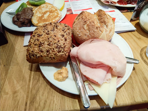 A great place to have a breakfast! We visited Cafe Extrablatt twice during 4 day stay in Heidelberg and both times we had a great breakfast. The interior looked great - I liked the wooden furniture and small details like the paintings behind the bar. The breakfast buffet costs 11.95€ on week days and 14.95€ on weekend. There is a wide choice of bread, cheese (vegetarian options available) and cold cuts (vegetarian option available). There are also various fruit spreads, nutella, peanut butter and similar stuff to eat with bread or a croissant. The pancakes were warm and fluffy - those were the best pancakes I had in my whole life! They were especially good with fruits and chocolate pudding. If you take a look at the menu you will find a great amount of vegetarian options of various dishes be it a schnitzel, a salad, a wrap, or a pizza. This places really gives you a wide choice of dishes. Everything was delicious and fresh, I highly recommend...