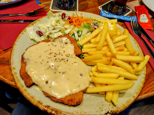 Küche: Eine vernünftige Auswahl aus Steak, Schnitzeln, Burgern und Salaten - was man auch erwartet wenn man den Laden betritt. Bestellt wurde ein ‚Pepper Steak‘ mit Pommes und Salat. Pommes waren sicher zugekauft und somit okay, der Salat war reichlich, die Soße sicher aus dem Eimer, das Steak wurde in ‚medium rare‘ bestellt - geliefert wurde ‚medium rare‘. Das hatte ich so nicht erwartet, spricht also für die Küche. Gut. Die Pfeffersoße hatte dann doch vier (!) Pfefferkörner, aber im Grunde ist gegen die Qualität des Essens nichts einzuwenden. 3 / 5 Sternen.
