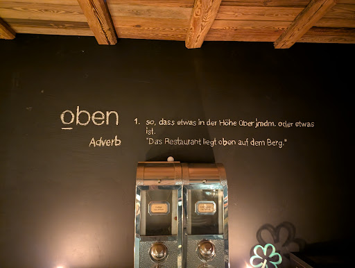 Das Restaurant ist liebevoll eingerichtet. Viel Holz, überall stehen Kerzen. Alles strahle eine unglaubliche Vertrautheit und Ruhe aus. Man wurde "geduzt", leise gut ausgewählte Musik im Hintergrund, nur ca. 12 Gäste. Diese vielen kleinen Details machen das OBEN zu einem besonderen Ort, an dem man sich sofort wohl fühlt.