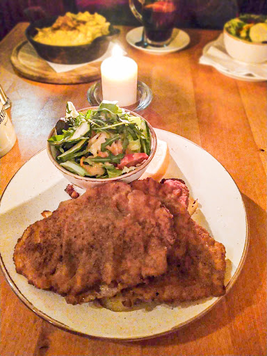 The restaurant is nicely located and Google maps is the best guide. You can easily see a few guys smoking just outside the restaurant. We did not need a reservation and I guess it's perfectly fine to plan for a walk-in. As soon as we entered, we looked for someone who can help in settling us down a table. There is no reception as such and with luck I found someone who helped us find a table for the night. They have a English menu. We ordered a Schnitzel and a large salad with fried turkey meat. The decor is good for a nice evening hangout. Each table has a cute little candle to freshen up your mood. They don't have regular water. So, you gotta buy a bottle of water which tasted more like sparkling water without the fizz. They provided a salad starter for free which seemed pretty interesting. The fried potatoes were too hot when served. The chef doesn't have an idea about the temperature at which food must be served. You don't give it right out of the pan. The pork in the Schnitzel was too dry. It should be rather juicy. The coating could easily break down which should not happen. But, the salad was a big disappointment. It was exactly the same as the starter salad with additional fried turkey and bleu d'avergene cheese. Dressing also similar. All this for 30 euro did not seem right at all (water for 5euro). No spaetzel on the menu. No cream sauce servings. Not the authentic German cafe experience I had in other cities. Do give it a pass and look for...