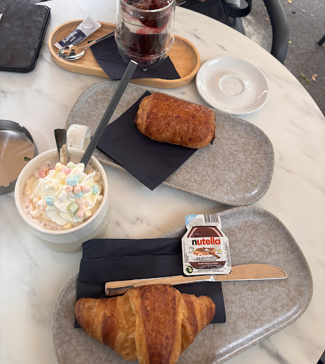Die Croissants waren gut, der Tee okay. Allerdings gab es kaum etwas zu essen oder zu trinken: Jeden Smoothie, den wir wollten, gab es nicht, und auch die meisten Speisen waren nicht verfügbar. Wir wollten zum Beispiel ein Croissant mit Burrata und Tomaten, gab’s nicht. Stattdessen haben wir nur ein einfaches Croissant mit einer kleinen Packung Nutella bekommen. Da haben wir uns ehrlich gefragt, warum es mit Burrata und Co. nicht geht wahrscheinlich war einfach alles aus.