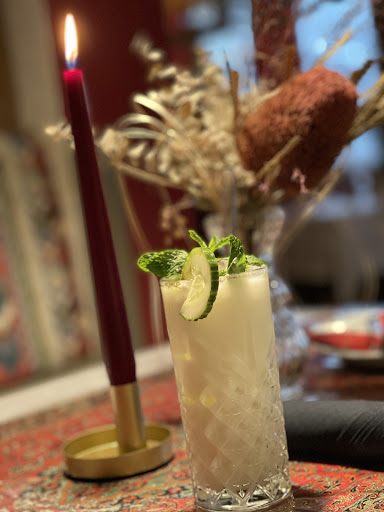 PERSIAN SOULFOOD خوش آمدی DRINKS Persian Spritz (Prosecco I Safran I Basilikumsamen I Rosenwasser)- 7,90€ Hugo alkoholfrei (Limette I Minze I Holunderblüte I Soda) - 6,00€
