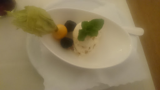 Nachtisch: das sorbet des Tages war leider nicht meinen Erwartungen entsprechend. 1 von 2 kugeln war eher wassereis, bruchstücke Heidelbeeren Wiesen Stiele auf annanas hatte einen Beigeschmack wie auf dem Brettchen geschnitten wo Zwiebeln oder beerlauch drauf war und leicht nach Alkohol ob jetzt Alkohol drinnen war weiß ich nicht...
