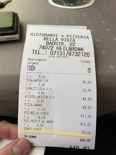 Wir haben uns von den Bewertungen und schönen gegend blenden lassen. Schlechtestes Restaurant inkl. schlechteste pizza in ganz Deutschland. Chef raucht ganze zeit auf der Terasse/Balkon und chefin ist so unfreundlich wie man es sich kaum vorstellen kann. Mit EC karte kann man zahlen, aber erst ab 20 Euro, was wir erst erfahren haben am Ende als wir split pay machen wollten. Die pizza hat einen dünnen boden und schmeckt überdurchschnittlich schlecht, sie wird in einer Form gebacken was bedeutet da steckt kein waschechter pizzakoch dahinter. Personal einfach so unfreundlich und schlecht. Wir haben eine pizza geteilt auf zwei tellern und es wurden uns eine servicepauschale, siehe foto von 2 Euro angerechnet. Extreme Frechheit, haben dies angesprochen worauf die Chefin meinte das wäre normal 😂….. nie wieder bella vista.