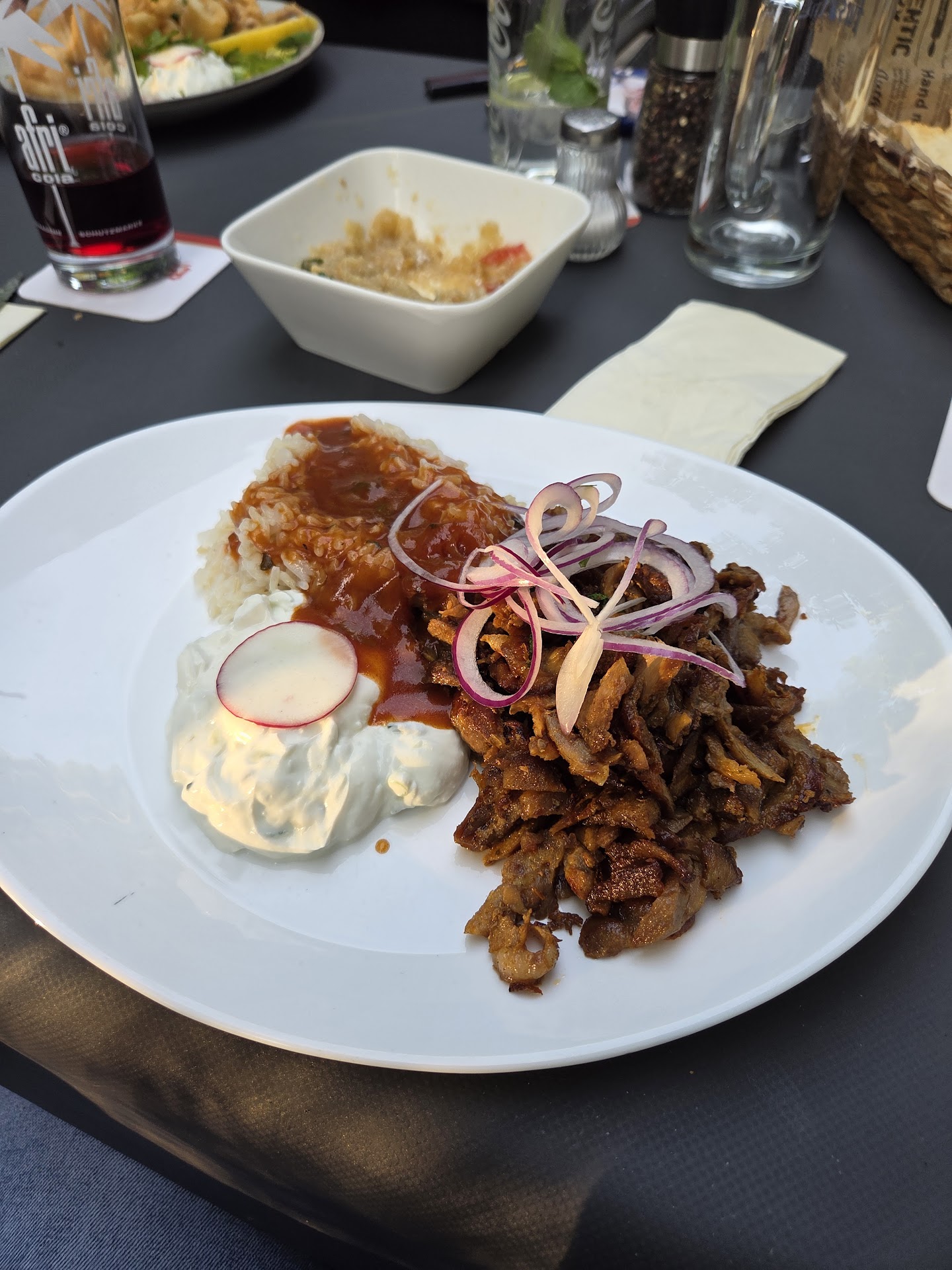 tut mir leid das sagen zu müssen..... aber bis dato der schlechteste Grieche echt schade das bestellte Knoblauchbrot ist nicht gekommen... bei den Pommes hat salz gefehlt die Kellnerin wenig Überblick etwas verplant als das essen kam waren plötzlich mindestens 20 fliegen um uns rum haben dann festgestellt dass die fliegen vom rododendron gekommen sind sie Kellnerin erklärte dann auf die Nachfrage od die Pflanze zum Restaurant mit dazu dass der zur Stadt gehört somit könne man ihn nicht entfernen ganz ehrlich die Stadt stellt da bestimmt keine Pflanzen in kleinen Töpfen dort auf und gießt sie täglich die Teller sahen sehr leer aus da nur Pommes und das Fleisch darauf war.... und sonst war nichts drauf sah traurig aus das Fleisch sah aus wie Gulasch aufm Spieß draufgespießt mit Gewürze schade ich lege das eben als schlechte Erfahrung bei Seite und gehe dort...