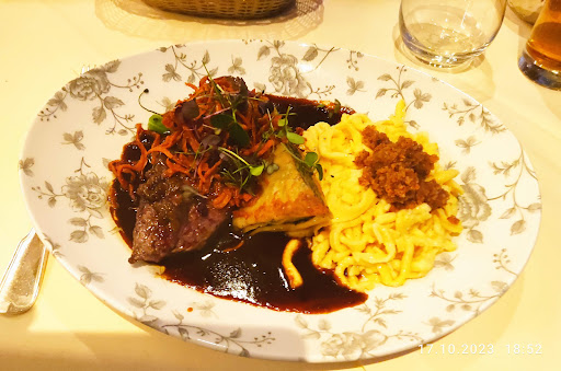 Dann kam der Knaller des Abends. Es kam 1x das vegane Gericht und 1x das vegetarische Gericht. Als dann die Veganerin am Tisch äußerte, dass sie das vegane Gericht bestellt hätte und hier auf Ihrem Teller ein pochiertes Ei wäre, kam als prompte Antwort : „ja das passt so, das gehört zum Gericht“. Erst als wir dann die Servicekraft aufklärten, dass ein Ei sicherlich nicht vegan wäre und ja auch beide Damen das gleiche bestellt, aber unterschiedliches erhalten haben, wurde nochmals nachgeschaut und festgestellt, dass hier ein Fehler passiert war. Dann die Frage des Abends: „ja wollen sie das dann nicht essen?“. Wir hatten dann das Glück, dass die Dame am Tisch, so nett war und von sich aus einen Tausch am Tisch vorgeschlagen hat. Dieser wurde mit den Worten „Na dann passt ja jetzt alles“ quittiert. Trotz dessen dass die Dame mehrfach zum Ausdruck gebracht hat, dass Sie das Gereicht extra wegen dem enthaltenen grünen Spargel bestellt habe, aber bevor die Kollegin nochmals 30 min warten muss zum Tausch bereit ist, kam keiner der Servicekräfte auch nur ansatzweise auf die Idee anzubieten, dass man etwas Spargel in der Küche ordern und als Ausgleich servieren könnte. Nein, es wurde statt dessen der Kollege, der die Bestellung aufgenommen hat an den Tisch gerufen um zu klären, wer der Gäste nun was falsches bestellt hätte. Nachdem alle am Tisch ausdrücklich bestätigt hatten, dass der Fehler nicht bei den Gästen, sondern auf der anderen Seite lag (es war derselbe Kollege, der so freundlich Auskunft über den Cocktail gegeben hat), wurde bei einem schweifenden Blick über die Runde festgestellt: „Aber jetzt hat ja jeder etwas zu essen – dann passt das ja - da hab ich mich wohl vertan“ …. Und wollte gehen. Daraufhin haben wir ihn dann auf die Soße angesprochen, um die wir gebeten hatten und um zusätzliche Beilagen. Denn die Portionen sind leider nicht dazu geeignet einen erwachsenen Mann, der wirklich Hunger hat satt zu bekommen. Die Menge an Filet war ausreichend, wenn auch nicht überdimensioniert. Dazu eine MiniMaultasche auch vollkommen in Ordnung. ! 2St. ! Schupfnudeln ... lachhaft ... Und ein überschaubares Häufchen an Spätzle -- Wir 3 Männer haben uns angesehen und waren uns einig, dass wir davon nicht satt werden würden.