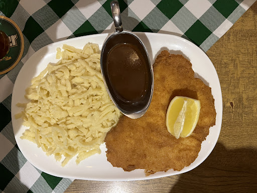Bestellt wurde ein Kalbsschnitzel mit selbst gemachten Spätzle und einer Jus. Nach einer guten aber für diesen Aufwand nicht allzu langer Zeit kam das Schnitzel an. Es war Goldbraun und hatte eine knusprige Panade. Es war perfekt gewürzt und hatte dieses leichte Aroma von Butterschmalz. Die Spätzle waren selbst gemacht und hatten eine gute Konsistenz. Die Jus war relativ mild was aber dank des perfekten Schnitzels unproblematisch war, es soll ja auch der Unterstützung des Geschmacks dienen und nicht das Schnitzel überdecken. Wer auf der Suche nach einem sehr guten traditionellen Wiener Schnitzel ohne Schnick Schnack ist, kommt hier voll auf...
