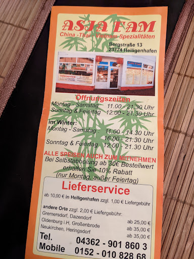 Pracujem v Hamburgu, no byvam v Heiligenhafen. Toto miesto som navštívil po prvý krat asi pred troma mesiacmi. Môj prvý dojem bol taký zvláštny. Neviem ešte dobre komunikovať nemecky a ťažko sa mi orientovalo. Prvý krát som si zobral jedlo zo sebou. Pamätám si že to bolo 1.Peking Suppe a jedlo Nr.50. Jedol som to pri mori a vravel som si waaw. Neskôr som tsm bol s kolegyňou kedy som si už vyskúšal jedlo skonzumovať priamo v Asia Fam. Bolo to skvele , čerstvé a úplne horúce čo dokazovalo že jedlo bolo robené o pár sekúnd skôr ako mi ho priniesli. Potom som sa tam o par týždňov vratil znova. Vždy ale si dam Peking Suppe. Túto polievku milujem ešte z času keď som žil na Slovensku. Nijde som nevedel takú polievku nájsť ako mi chutila na Slovensku a tu v Heiligenhafen ktorý zbožňujem som ju našiel. Presne takú akú ju mám rád. Pred dvoma dňami som bol opäť v Asia Fam, tento krát som to nenal v pláne. Bol som na prechadzke s mojim MiniYorkom , ale keď sme išli okolo Asia Fam neodolal som. Najskôr som sa spýtal či môžem ísť dnu aj z mojim štvornohým kamarátom. Odpoveď bola áno. Už v tomto momente si ma ziskzli na 100%. Objednal som si ako inak Peking Suppe a č.41 s jedalneho lístka. Opäť jedlo bolo horúce teda aj čerstvé. Vyzerá to že Asia Fam je rodinný podnik a ja som sa tam tak aj cítil. Môj návrat do Heiligenhafen po mojich pracovných dňoch v Hamburgu bude vždy patriť aj na chutné a kvalitné jedlo...
