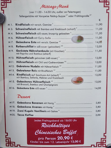 Es tut mir leid, aber ich kann leider echt nicht mehr als einen Stern geben. Ich war heute Abend dort essen. Ich habe jetzt nicht Gott weiß was erwartet und wurde dennoch enttäuscht. Das Essen wurde als reichhaltiges Buffet angepriesen. Also das war vieles, aber reichhaltig? Auf etwa 3 Meter Tisch wurde ein wenig Essen angeboten. 1 Meter davon war Nachspeise. DieSptossen waren sauer, die gebratenen Nudeln waren unterirdisch, alternativ gab es lediglich gekochten Reis. Fleisch und Fisch gab es, aber mit chinesischem Essen hatte davon die Hälfte nichts zu tun und geschmacklich war es maximal mittelmäßig. 2 Suppen die es noch gab, möchte ich nicht unterschlagen, da ich diese nicht probiert habe, kann ich diese aber nicht beurteilen. Die Musik hatte auch nichts mit dem zu tun, was man aus Chinarestaurants kennt. Da wurden Lieder wie let it be musikalisch dargeboten. Schön, aber in einem Chinarestaurant? Die Bedienung wirkte lustlos und fragte (zum Glück) erst gar nicht, ob es geschmeckt hat. Und das alles für einen Preis von knapp 24 Euro ohne Getränke. Es tut mir leid, aber ich habe mich dort nicht wohl gefühlt und fand das Essen wirklich...