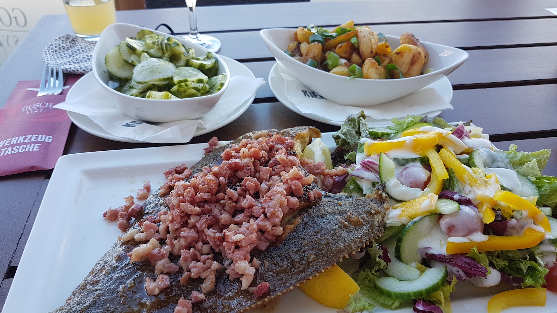 Wir wollten zum Nachmittag noch schnell etwas Gutes und Warmes essen und auf dem Weg lag die neue Filiale aus der Gosch-Kette. Wir wurden sehr freundlich empfangen und am Counter schnell bedient. Optisch mit Sicherheit schon recht ansprechend aber das Essen punktet leider in keinster Weise hinsichtlich Geschmack und Qualität. Wir haben je 2 ganze Schollen, Bratkartoffeln und Gurken-Dill-Salat bestellt. Die Schollen waren in Öl angebraten. Leider weder kross noch mit einem kleinen Stich Butter angebraten. Das Fleisch war fade, bröselig und hat null nach Scholle geschmeckt, was nur bei TK-Ware vorkommt. Geschmacklich wurde es mit fünf großen Esslöffeln Speck auch nicht besser. Die Bratkartoffeln waren sehr gesichtslos und bestanden meiner Meinung nach aus einem Convenience-Produkt und hatten eine zu weiche Konsistenz. Weder mit Zwiebeln noch mit anderen Zutaten gebraten. Es wurden nur zur Optik rohe Frühlingszwiebeln drüber gestreut, was völlig überflüssig ist. Das Salatdressing war meiner Meinung nach auch ein Convenience-Produkt und schmeckte langweilig - halt eine Soße. Der Gurkensalat war ok. Zudem waren die Mengen viel zu üppig. In einem Fischrestaurant hätte ich mir wirklich etwas anderes vorgestellt. Eine Freude kam beim Essen nicht auf. Leider ist ein Anspruch für Qualität am Essen, aus den ursprünglichen Anfängen von Gosch, nicht mehr zu erkennen. Das Corporate Design und die Marke fressen viel Geld....am Ende sollte aber die Ware im Mittelpunkt stehen und nicht nur das Drumherum. Man möge sich daran erinnern...die einstige Fischbude in List auf Sylt hat gebrummt weil die Qualität gut war und nicht weil das Drumherum außerordentlich war. Das ist hier leider nicht...