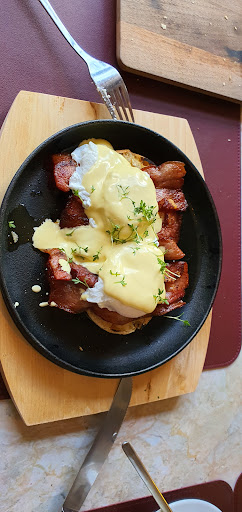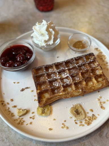 Read moreVanwege alle fantastische reviews hier met aardige verwachtingen wat gaan eten op een zaterdagavond maar ik kon er niet echt iets bijzonders aan ontdekken. Ik moest zelfs even kijken of ik wel goed zat toen ik er net was. Ambiance was niet bijzonder gezellig of sfeervol en deed me denken aan een stationsrestauratie. Op zaterdagavond in Augustus was het ook helemaal leeg. Terras buiten aan de straat deed ook wat goedkoop aan. Bediening toen ik er was was wat gereserveerd. Kaart beperkt. Ik had een hamburger die nogal zout was. Wel rijkelijk belegd. Daarna de wafel met warme kersen gehad. Lekker maar ook niet erg bijzonder. Pluspunt is dat er fijne Amerikaanse country muziek draaide, afgerekend werd zonder ook maar een fooi te initiëren en er AMEX geaccepteerd wordt. Parkeren kan op het grote terrein aan de andere kant van de rotonde waar het restaurant aan ligt. In het weekend is dat blijkbaar gratis. Wellicht is de lunchkaart beter dan de avondkaart. Als de avond ervaring me meer overtuigd had was ik zeker nog eens...