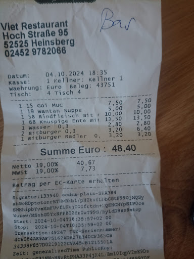 Update: So, this is like the fourth or fifth time we've gone to Viet Bistro in Heinsberg, and the experience has been a consistent Amazing! The restaurant has a quite cozy and relaxing atmosphere, the service is very friendly (they actually have great customer service, an often hard to find attribute in many restaurants in Germany), relatively quick and, the food is delicious and just the right size. Although, I'm still disappointed that I cannot find salt and pepper fried shrimp or squid like I'm used to in Asia. But, if you're in the local area and are in the mood for delicious Vietnamese cuisine or just want to try something new give them a try. I'm not a Pho lover but by wife said it's the best she's had in Europe and but the duck was "off the chain!".