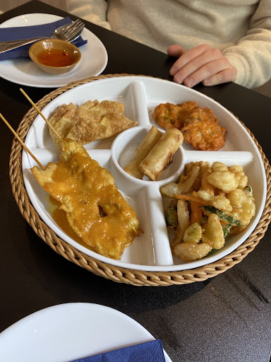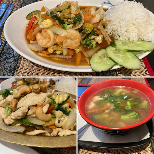Read moreFreundliche Bedienung, ganz nettes Ambiente daher die Sterne. Das Essen? Das Essen ist fad, fantasielos und teuer. Obwohl: die Dim Sum, die wir als Vorspeise geteilt hatten, die waren ganz gut. Ich vermute, dass sie geftoren gekauft und nur noch vor Ort gedämpft wurden. Die passten nicht zum Rest des Essens. Die zweite Vorspeise war der kross gebratene würzige Schweinebauch. Cornflake-Panade, fade, langweilig und zu fettig. Mein Mann aß Bratnudeln mit Garnelen. Auch sehr fettig. Weiter hätte ein bisschen Zitronengras und Koriander nicht geschadet. Ich hatte das Massaman-Curry, also DAS thailändische Gericht, über das es in Thailand sogar ein Gedicht gibt, das quasi jedes Kind kennt. So etwas habe ich noch nicht gegessen: einfach nicht zu tolerieren. Suppenfleisch (Rinderbeinscheibe) im Gericht! Unfassbar. war dann natürlich trocken und ungenießbar. Auch die Massamanpaste und die sonstigen Zutaten kannte ich so nicht. Sicher kann man das auch mit viel knackigen Paprika und Cashews machen. Das war mein kleinstes Problem. Nicht zu...