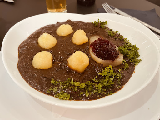 Ate here yesterday. The staff was friendly and attentive. We ate outside, so I can't comment much on the atmosphere inside. It was also nice that they informed us in advance which dishes were sold out, instead of telling us when we tried to order. However, what I really have an issue with are the prices. A glass of wine (0.2L) for €7.90 is quite steep for a restaurant. Additionally, €19.90 for a fried schnitzel with mushroom sauce (which was essentially gravy with four canned mushrooms), where you have to order the salad garnish separately for €5.90 and a tiny cup of sauce for €0.50. I find that to be too much for something that can only be described as a decent eatery and certainly not...