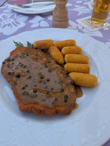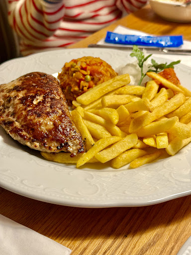 Read moreWir sind mit ca.30 Leuten dort zum Essen gewesen und da es ansonsten noch eine Hochzeitsgesellschaft gab,war die Parksituation ein Alptraum;der hauseigene Parkplatz komplett überfüllt und vom angrenzenden `Feldweg´wurde man freundlich von einem Anwohner weggeschickt(wir lassen hier öfters mal abschleppen).Die Panade vom Schnitzel fiel bei jedem Gabelstich wie Puzzelteile vom Fleisch;die Fritten kamen ohne Majo oder Sauce-gefragt,ob man welche möchte wurde auch nicht.Die Kellner waren bemüht andauernd nach neuen Getränken zu fragen,um den Umsatz anzukurbeln;als das am späteren Abend schleppender wurde,verließ ein Kellner den Raum mit abwertender Handbewegung;die Krönung des Abends war,das nicht wie sonst üblich am Tisch abkassiert wurde,sondern alle Personen zur Kasse kommen mussten,wo die Kellnerin(auf einem grossen Display)jede einzelnde Position raussuchen musste.Nachdem ich ihr sagte,das ich das Wiener Schnitzel hatte,und sie mir entgegnete"das Rahmschnitzel?" (die Karte lag daneben),war ich froh endlich da raus sein zu dürfen.Fazit:Wer sich einigermassen günstig(am Schnitzeltag)den Bauch vollhauen möchte und keine grossen Ansprüche stellt,ist da...