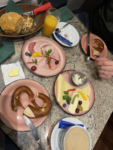 Read moreWir waren heute zum Frühstück, zwei Erwachsene und zwei Kinder 6 & 11 Jahre. Ab 9 Jahren zahlt man den vollen Preis beim Buffet, was ich nicht ganz ok finde aber egal, wussten wir ja vorher. Der Service war ok, freundlich und auch recht auf Zack. Das essen an sich auch ok, bei dem Preis wäre vll noch eine Brezel für die Kinder super auf dem Buffet. Ein O- Saft und ein Getränk sind bei dem Buffet dabei, einmal Rührei oder Spiegelei. Da ich kein O- Saft wollte, sondern eine O-Saft Schorle, wurde trotzdem der volle Preis berechnet, da hätte man ein kleines Wasser dazu gebucht und gut ist. Extra hatten wir noch ein Kaffee, ein Milchkaffee, eine Cola ach und mein Sohn hatte auch noch eine große O-Saft Schorle. Wir haben knapp 95€ bezahlt…Ich finde für den Preis am Buffet solle man sich zumindest den Saft und/oder Filterkaffee immer wieder selber zapfen können, vll noch Bacon, etwas mehr Wurst Auswahl oder oder oder…jedenfalls könnte man für das Geld...