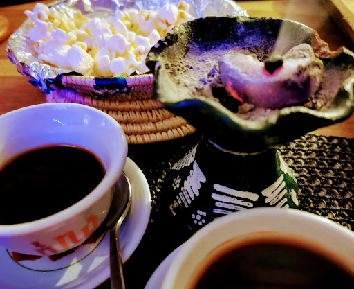 Das afrikanische Bier sollte man mal probieren, außerdem macht es Spaß es aus den Kokosnusshalbschalen zu trinken und beim Einschenken zuzuschauen. Was wir so am Nachbartisch an tollen Speisen gesehen haben machte außerdem Lust auf mehr. Da kam der Wundertopf mit Rindfleisch und Zwiebeln brennend aus der Küche und die Probierplatte für vier Personen konnte kaum noch getragen werden. Zwischendurch kam die liebe Bedienung mal mit der Pfanne voller gerösteter Kaffeebohnen vorbei, an der wir alle riechen durften. Fantastisch!