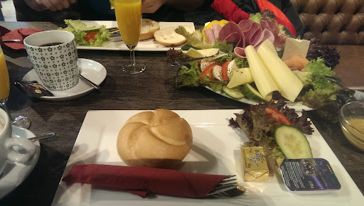 Wenn man nur normale Bäckereien kennt die einem ein "Frühstück" anbieten, dann denkt man, ok was soll hier denn anders sein? Allerdings wurde ich schnell vom Gegenteil überzeugt. Anders als bei den Bäckern, gibt es hier ein tolles für 5 Personen Mögliches Frühstück welches ähnlich wie ein Buffet gilt. Das Buffet ist mit vielen guten und leckeren Zutaten gefüllt, von einer Fleischplatte, einer Käseplatte und Lachs nach Wunsch. Alles wie man es erwartet. Dazu noch Rührei und Brötchen sowie Kaffee und Tee sind im Preis inbegriffen.