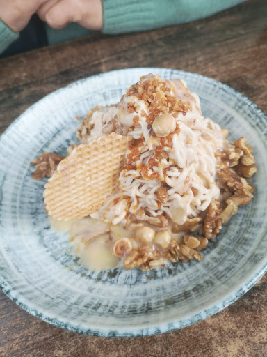 Read moreDas Eiscafe liegt zwischen einer Hauptstraße und dem Fahrrad /Fußgänger weg. Sie haben das beste daraus gemacht. Man kann sowohl draußen als auch drinnen sitzen. Oder direkt an der Straße oder etwas weiter nach hinten. Das Café bietet auch frühstücksgerichte an. Wir hatten zwei mal Eis: Spaghetti Carbonara und ein Eierlikör Becher. Der Eierlikör Becher hätte ruhig etwas mehr Eierlikör vertragen können. Das Schokoladeneis darin war "köstlich" (sagt meine Freundin). Es schmeckte halt richtig gut nach Schokolade. Der Spaghetti Carbonara hatte eine ordentliche Portion Nüsse. Wir haben vor ein paar Jahren dort auch schon mal zum Frühstück gegessen und waren auch sehr begeistert. Hier gehen wir bestimmt...