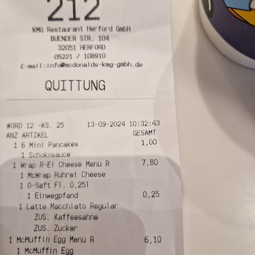 Read moreWir haben vergangenen Sonntag hier über die Lieferando App Essen bestellt, bestätigte Lieferzeit wurde mit 50-65 Minuten angegeben. Als dann nach 1h40min noch keine Lieferung erfolgte nutzte ich die angegebene Telefonnummer um Kontakt zur Filiale aufzunehmen um nachzufragen. Abgenommen wurde mit "Ja?" Keinerlei Meldung, dass ich im McDonald's Herford gelandet bin, ich fragte wie es mit meiner Bestellung aussieht und bekam in sehr schlechtem Deutsch zur Antwort "Fahrer macht sich jetzt auf den weg, Entschuldigung." Ok dacht ich mir, von mir zuhause aus fahre ich im schnitt 10-15 Minuten. Nach weiteren 30 Minuten bekam meine Frau dann über Lieferando die info, dass unser Essen gerade zubereitet wird und in ca. 19 Minuten eintrifft...Ernsthaft? Ich dachte es sei seit 30 Minuten unterwegs... als unser Essen dann endlich nach etwa 2,5h eintraff wurde, als wäre es nicht miserabel genug gelaufen, noch ein falsches Getränk geliefert als bestellt, auf dessen Nachlieferung haben wir weitere 40 Minuten gewartet. Das Essen war lauwarm und lieblos zusammengeworfen, früher hat man wenigstens zur Entschuldigung eine Apfeltasche oder so bekommen aber Fehlanzeige, außer einem "Sorry" bekamen wir nix. Bestellen werden wir auf keinen Fall wieder, ich weiß, dass die Systemgastronomie stressig sein kann aber sorry, dann darf ich keine zusätzliche Lieferung anbieten, dass ist vermutlich der Grund, warum der Burger King das nach Erprobung wieder eingestellt hat. Lernt bitte aus sowas! Und bekommt eure Mitarbeiter in den Griff, unser letzter Besuch in der Filiale war überschattet von asozial wirkenden Mitarbeitern die sich durch die halbe Filiale mit "Junge, Alter, Opfer und verarsch mich nicht" anschreien. So ein Slang hat bei der Arbeit mit Gästen nichts verloren.