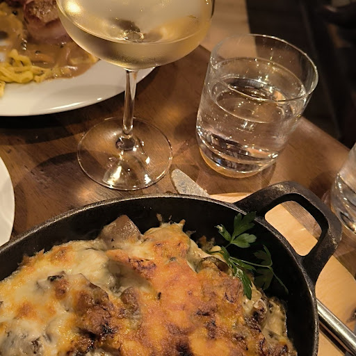 Great atmosphere in a restaurant that ticks all the boxs for anyones idea of what a traditional German restaurant might look like. Unsuprisingly the wine offerings are supurb with wine from all over Germany and the knowledgeable staff will hapily guide you through and make recomendations. Food is predicatibly meaty and dishes of various regions are on offer. The presentation of the food was fantastic and there were good vegetarian options . Prices were reasonable although be aware that you must pay in cash....