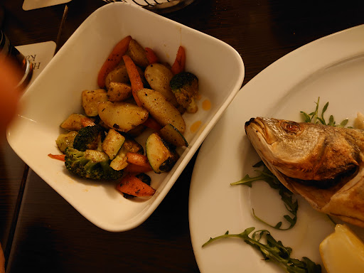 Zur Hauptspeise: überwiegend wurde Pizza oder Nudeln bestellt. Die Pizze sahen für mich, als einem für die der Teig der Pizza entscheidet ist, richtig gut aus. Ich hingegen hatte den Wolfsbarsch in Zitronen-Buttersoße, frisches Gemüse, Drillinge. Ich wurde gefragt, ob ich den Fisch filetiert serviert bekommen wollte oder nicht. Ich wollte den Fisch unfiletiert. Zur Beilage. Leider war sie als sie an den Tisch kam schon nur noch lauwarm, sodass ich die Beilage quasi als zweite Vorspeise gegessen hatte... Leider war es auch von der Menge eher eine Vorspeise; 2 geviertelte Drillinge, ein paar Brokkoli Röschen und genau so viele Zucchini Scheiben sind für meinen Geschmack etwas wenig, ja, das in der Schale war die gesamte Beilage. Daher war bin ich auch nicht satt geworden. Was ich schade fand, da der Fisch schon gut und lecker war. Nur die Zitronen Buttersoße hab ich vermisst und nicht rausgeschmeckt.