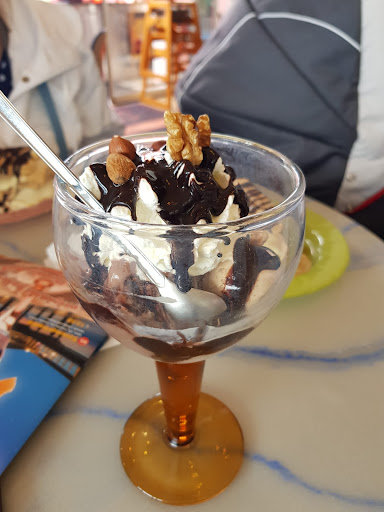 Das Eis ist solide, aber auch nicht herausragend, schmeckt in Ordnung. Die Kuchenauswahl ist vielfältig, was positiv ist. Allerdings wird die Schlagsahne aus der Sprühdose serviert, kein Weltuntergang, aber eben auch kein Highlight.