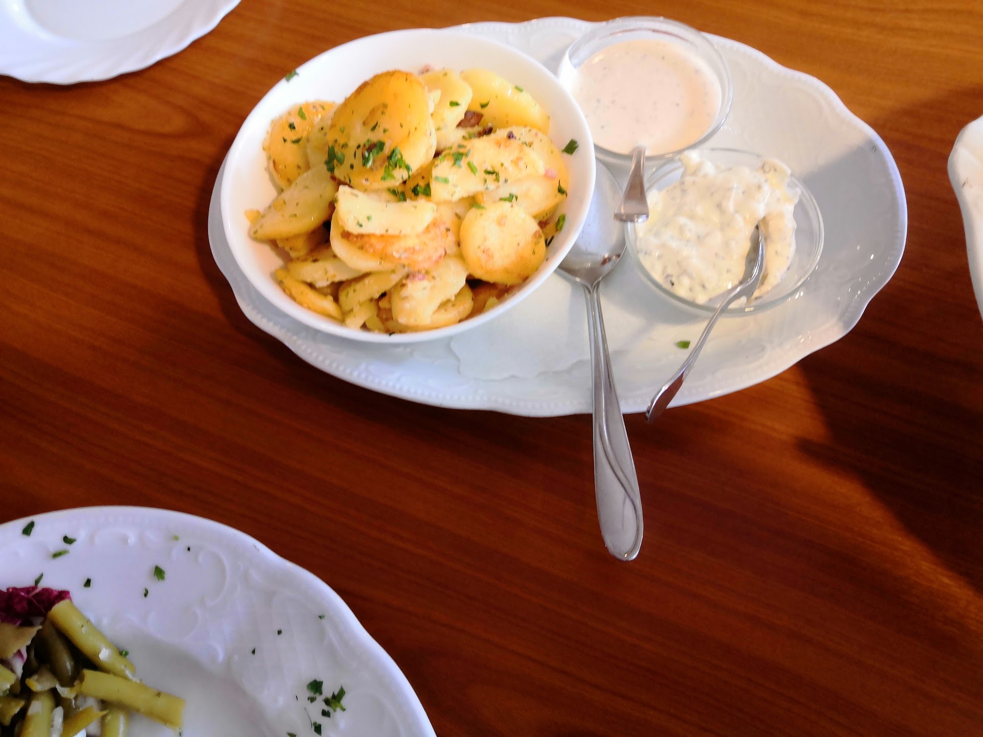 The fish platter included plenty of fish. There was salad decoration, some fried potatoes, fresh tartar sauce and pink aioli sauce with it. Taste-wise, the platter is highly recommended. We had the rest of the fish platter packed with some remoulade and came home with it (As a small note, we allow ourselves to write that it can be a little more fried potatoes for us ;-) )
